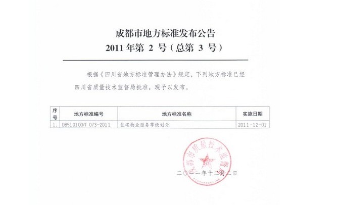 上一条:关于四川省(区域性)地方标准《住宅物业服务等级划分》有关问题说明的通知 下一条:关于我市物业服务等级划分物业服务收费政府指导价标准及有关问题的通知