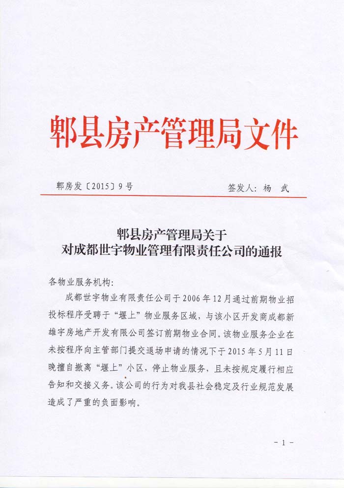 上一条:关于对成都蜀信物业服务有限公司等5家企业予以表扬的通报 下一条:关于对成都合力物业服务有限公司的通报