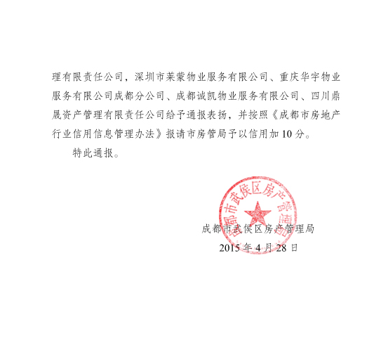 上一条:关于开展2015年度“走近十佳”优秀物业服务项目学习交流活动的补充通知 下一条:关于对成都明远物业发展有限公司等3家企业予以批评的通报