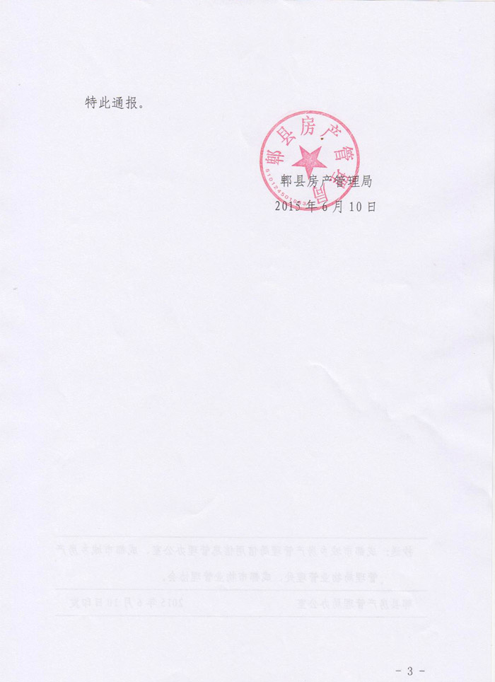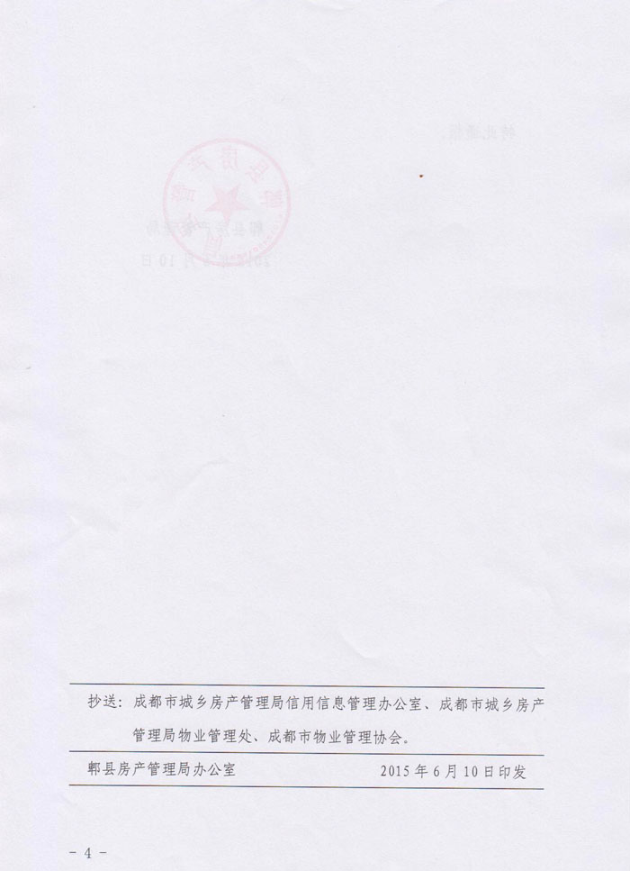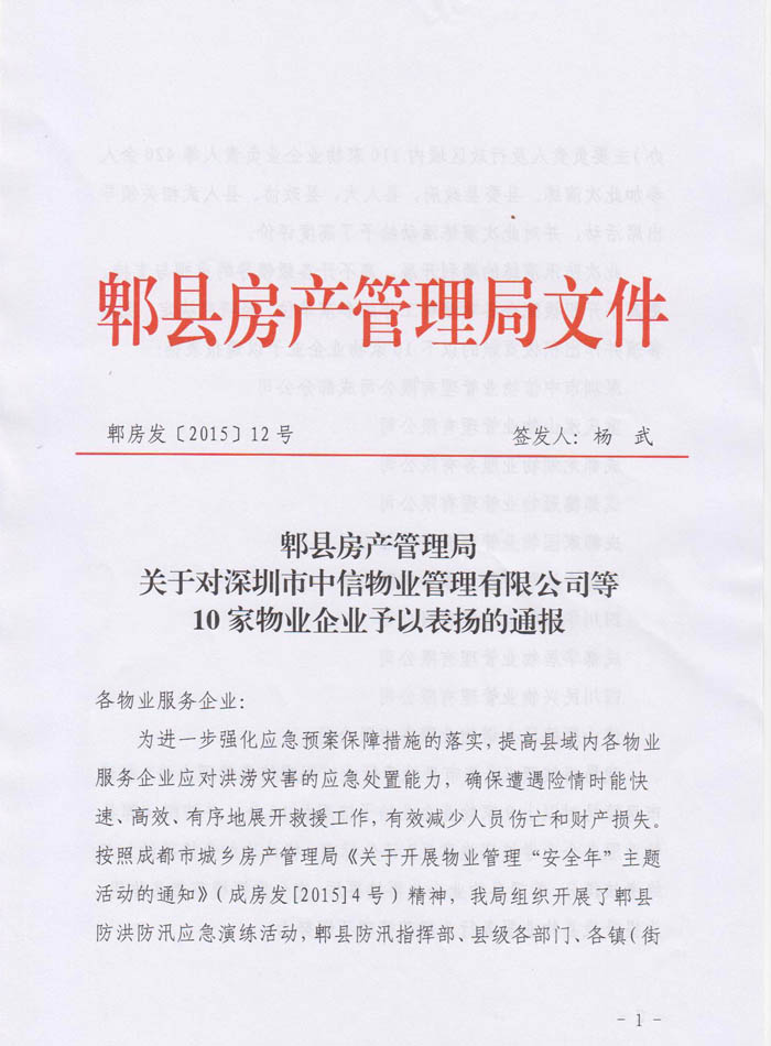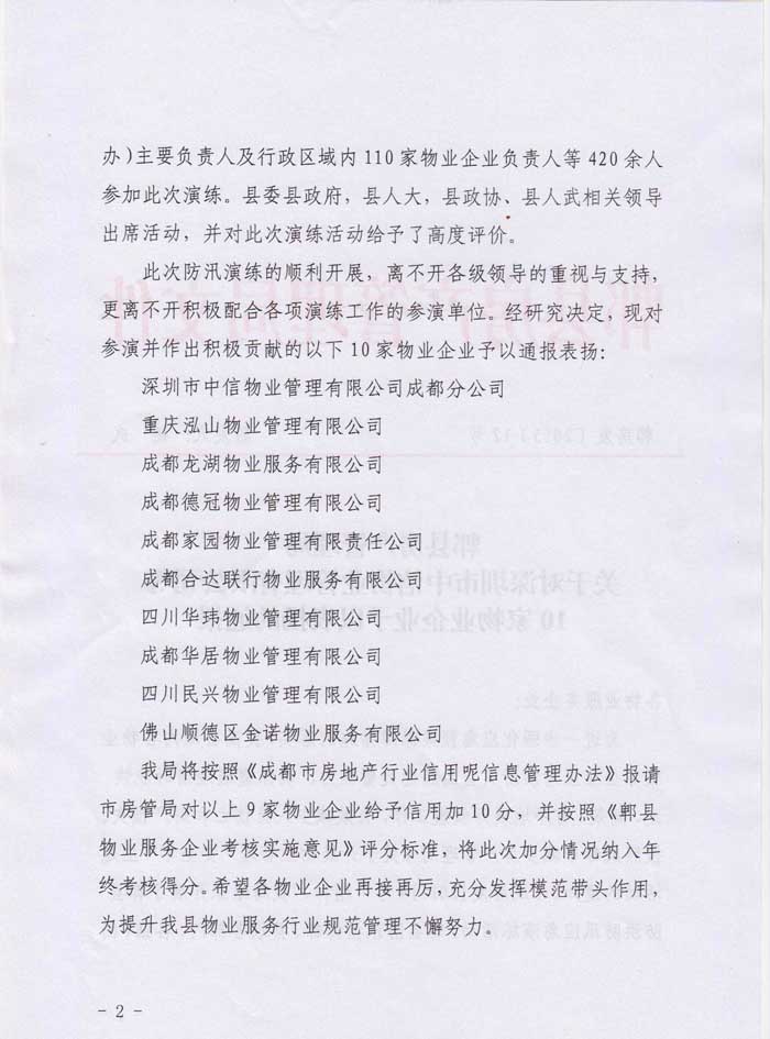 上一条:关于对成都新和志远物业管理有限公司的通报 下一条:关于对深圳市中信物业管理有限公司成都分公司予以表扬的通报