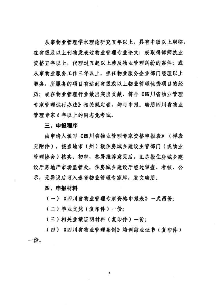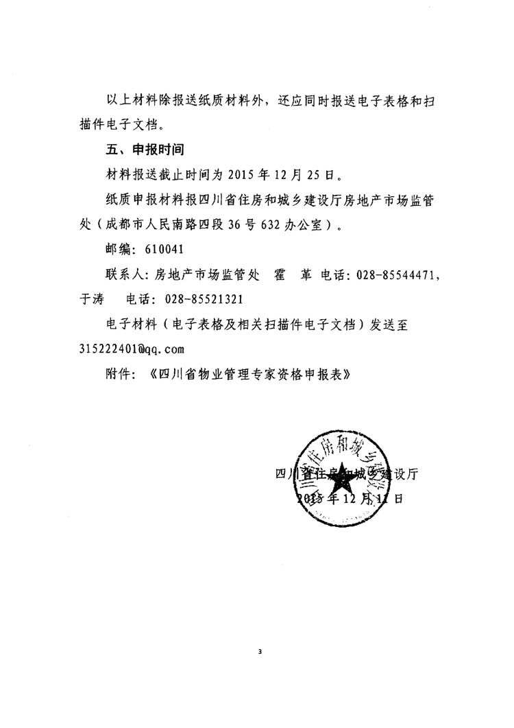 按照《通知》要求,凡在我市行政区域内,符合申报条件的,由申请人填写《四川省物业管理专家资格申报表》,并于2015年12月17日至2015年12月23日(星期六、星期日除外)将相关材料报送市房管局物管处。