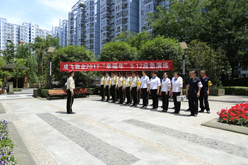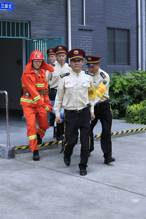 第一阶段:疏散引导。14点28分,成飞物业工会主席胡波下达演练开始号令,并由其担任演练总指挥。盛畅园物业服务中心立即启动突发事件应急预案。应急团队分成警戒、疏散、引导、接应、设施设备保障五个战斗小组,按照预案的分工部署迅速奔赴各战位。同时,关闭相应建筑物水电气总阀,开启单元、小区门禁,引导业主从建筑物中向小区外安全集结点疏散。