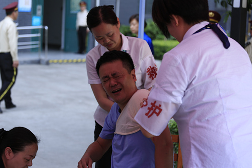 第二阶段:搜救救护。该阶段分四个步骤进行。第一,搜救组进入建筑物进行搜救。第二,利用担架和轮椅将搜救组搜救到的一名头部受伤并昏迷的业主与一名肩部腿部受伤的业主输送至中庭的救护站。第三,在救护站,救护组对头部受伤昏迷的业主实施心肺复苏抢救及伤口包扎,对肩部腿部受伤的业主实施伤口包扎。第四,救护组将已初步脱离生命危险的业主搀扶上应急救护车,随即送往医院进行后续治疗。