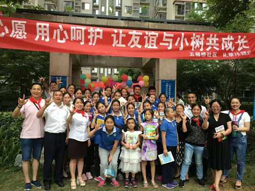 活动分为四部分:儿童作品展、文艺演出、集体绘画和种植友谊树。作品展作品丰富,有特殊儿童的刺绣、漆器作品以及社区儿童绘画,每一幅作品都是精心制作,获得了现场观众一致好评。文艺演出精彩不断,手语老师现场教学手语表达节日祝福,朗诵节目《妈妈》拨动观众心弦,一曲竹笛《红高粱》更是惊艳全场;集体绘画,小朋友或跪、或趴,用五颜六色的彩笔在主题为“我爱成都,幸福家园”的画板上描画心中美好家园。最后,小朋友两两结对,在镏金岁月的喷水池旁种植友谊之树。活动结束时,华玮物业负责人为小朋友赠上课外读本并合影留恋。