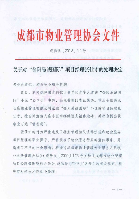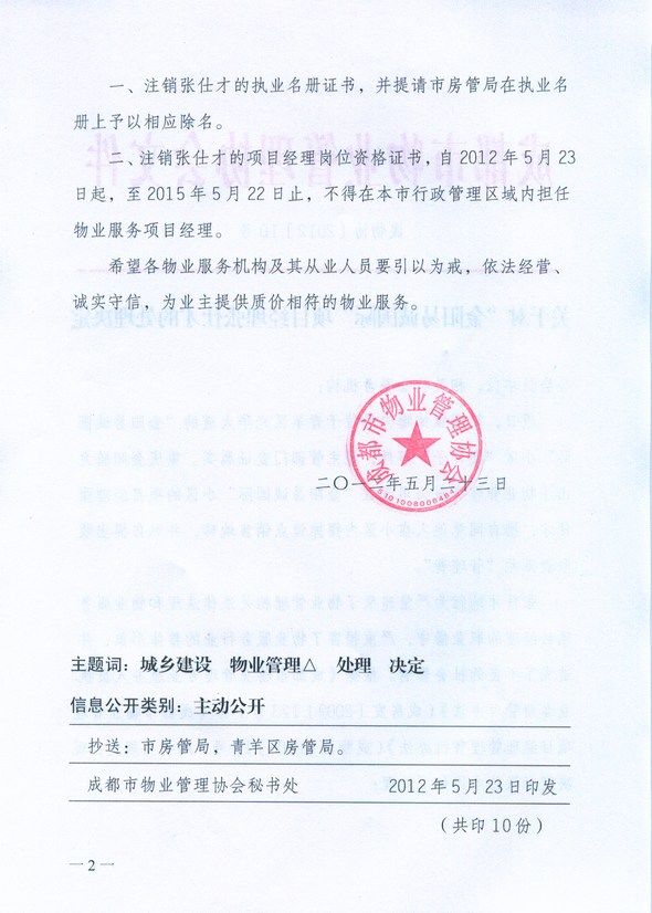 上一条:关于对张仕才从成都市物业管理专业服务人员执业名册上予以除名的决定 下一条:关于开展2012年度成都市物业管理优秀项目考评工作的通知