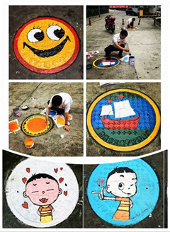 盛夏七月,鸟语蝉鸣,万木葱茏。走进位于西三环一段的大合仓办公仓储园区,你会惊奇的发现,环绕大厦的机动车路面上,一个个圆形、可爱的图画映入眼帘:“大头儿子”、“卡通笑脸”定格在相距不远的窨井盖上,将黯然无色的窨井盖变成了一幅幅精妙绝伦的作品,呈现出一道亮丽的风景。