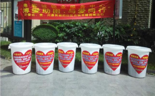 2015年6月19日,志愿者协会拉来了12个大塑料桶分别放置在弗客城、弗客水岸两个项目,用于装捐赠物品。项目物业服务中心及时发出通知,加大宣传、动员力度,在项目全体员工的配合下,广大业主积极响应,纷纷拿出自家的衣物、书籍、书包、鞋帽等日常物资,自觉装进大桶内。由于数量较大,小区每天收纳的物品都能装上一大车。今年冬天,总算能让贫困山区的一大批孩子们不再挨冻了,同时也解决了孩子们的一些学习用品欠缺的难题。虽然这些物资微不足道,但它代表的是广大业主们的一片心意,这也是他们能积极参与到这次公益活动的最终目的。