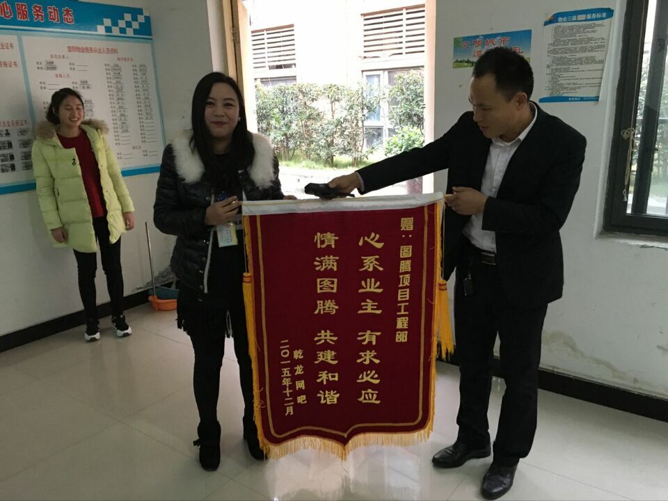 2015年12月2日刚到上班时间,图腾国际商业中心乾隆网吧店主就来到望阳物业图腾国际客服中心,将一面写有“心系业主,有求必应,情满图腾,共建和谐”的大红锦旗赠送到客服中心工程部经理手中,并由衷的说到:感谢你们不怕脏,不怕臭,及时为我们解决了卫生间渗漏水的难题,真是太感谢了!