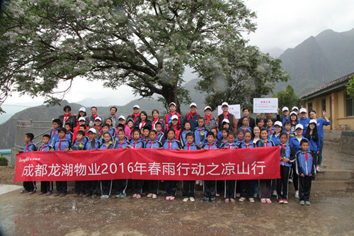 2016年4月成都龙湖物业给凉山州的青纳乡小学、和爱小学捐赠了价值约14万的物资,其中不乏有龙湖业主和员工捐赠学习用品及生活用品,并带领着30多位业主和员工代表走访了凉山州的青纳乡小学。