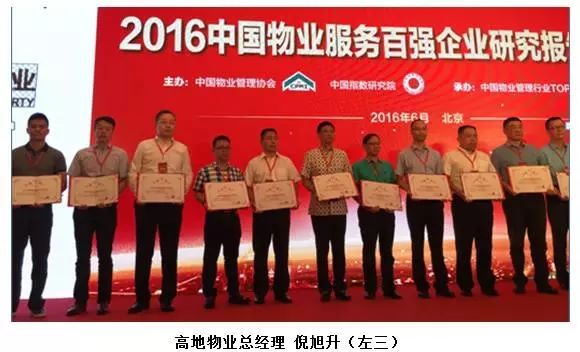 6月21日,由中国指数研究院和中国物业管理协会共同主办的“2016中国物业服务百强企业研究报告发布会”在北京珠三角JW万豪酒店召开。2016年,中国指数研究院和中国物业管理协会共同成立“中国物业管理行业TOP100研究组”,运用科学的评价方法和指标体系,对中国优秀物业服务企业进行了系统研究,形成了2016中国物业服务百强企业研究报告。大会表彰了物业服务优秀企业, 高地物业凭借优秀的表现,位列“2016中国物业服务百强企业”第37位。