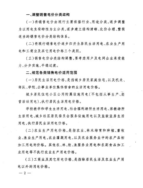 (二)将现行销售电价逐步归并为居民生活用电、农业生产用电和工商业及其它用电价格三个类别。