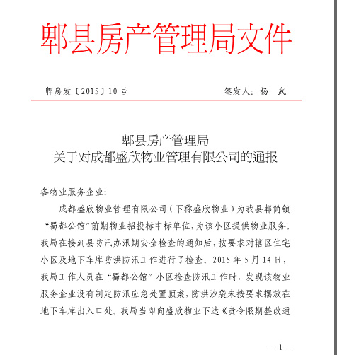 上一条:关于开展2015年度“走近十佳”优秀物业服务项目学习交流活动的通知 下一条:关于对成都蜀信物业服务有限公司等5家企业予以表扬的通报