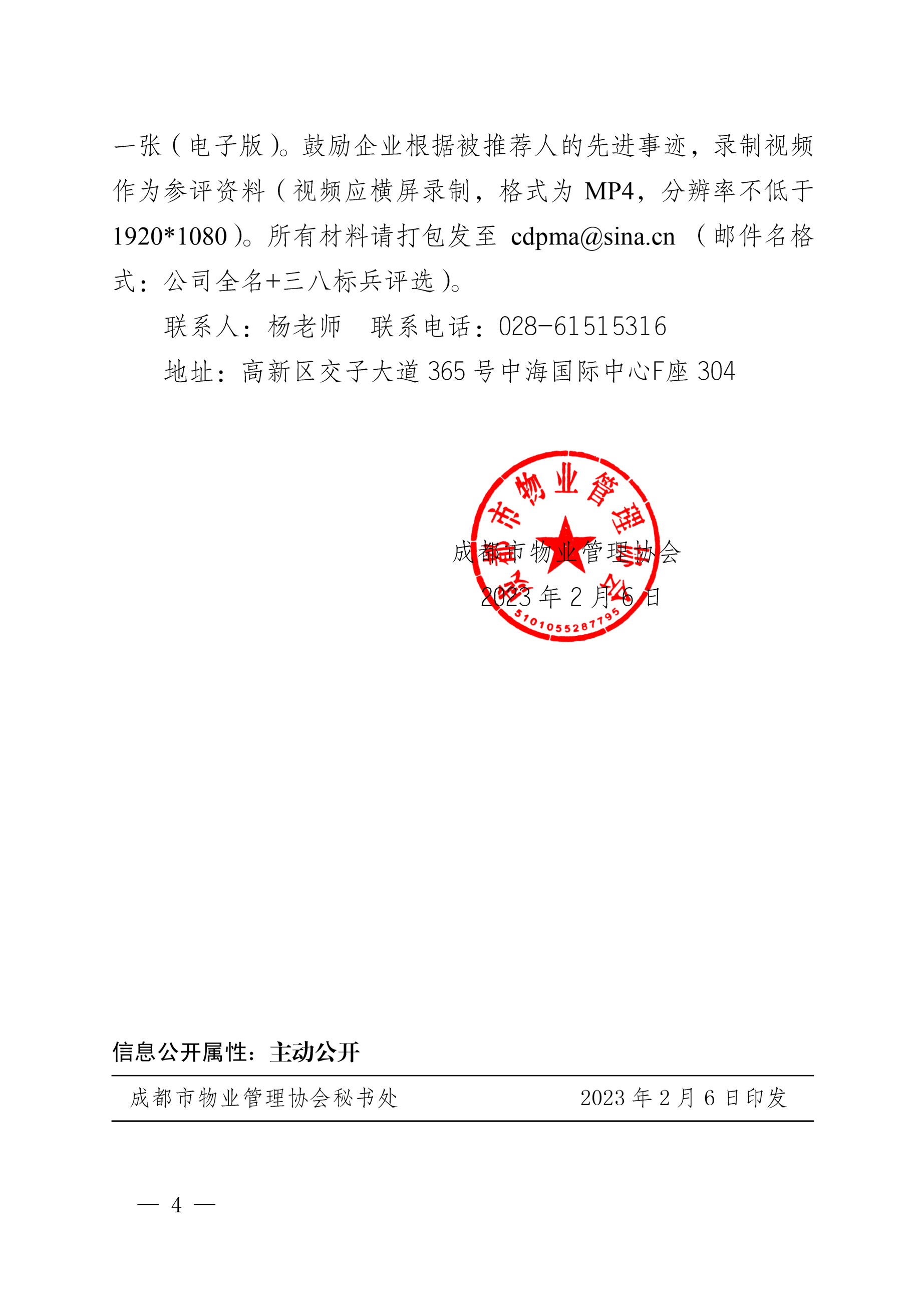 【点击下载:成物协发〔2023〕4号(关于开展2023年成都市物业服务行业三八标兵和三八红旗手评选活动的通知】